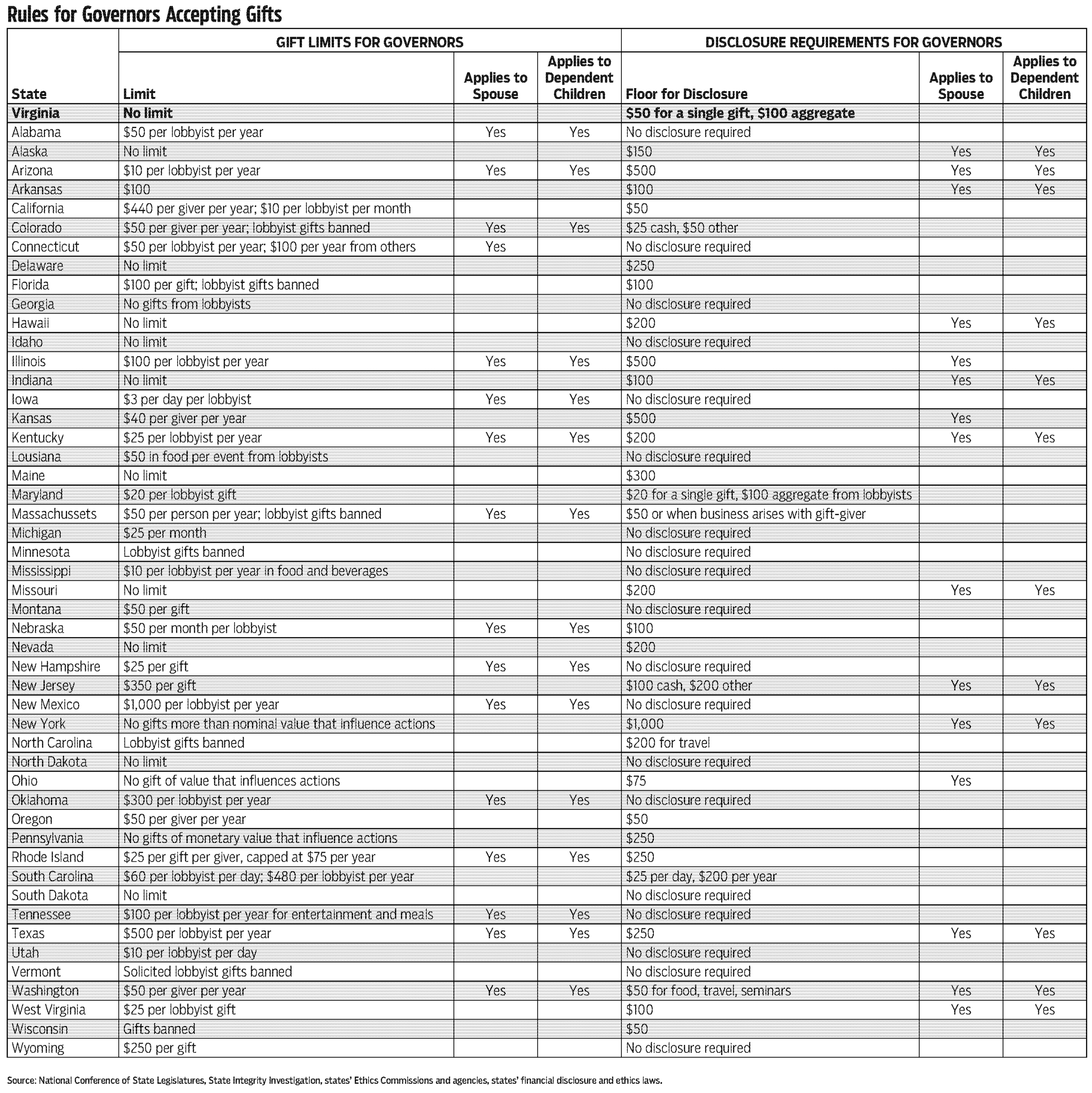 its governor may directly accept from lobbyists and others transacting government business. Virginia’s law only requires that the governor list on an annual disclosure form any gift worth more than $50, or series of gifts from an individual worth more than $100. Thirty-one states set cash limits on gifts and six states have gift bans.