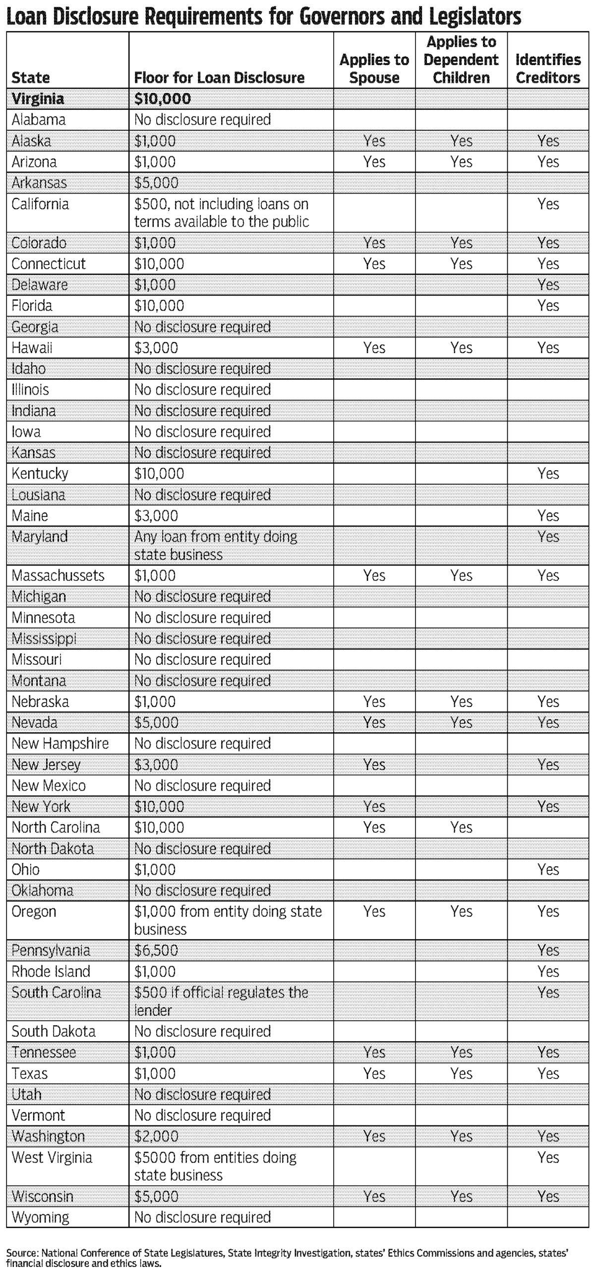 • Virginia is among 23 states that does not require statewide politicians and legislators to list creditors by name. State disclosure forms only contain boxes that must be checked if the office holders have loans of more than $10,000 from broad categories of lenders, such as banks, insurance companies, and finance companies.