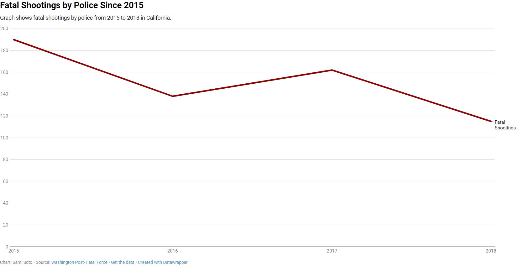 Graph shows fatal shootings by police from 2015 to 2018 in California.