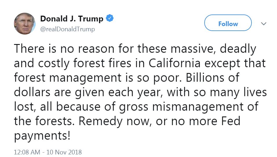 Trump’s tweet, which was his first public comment on the fires, blamed the state’s poor “forest management” for the infernos and threatened to withhold federal funding.