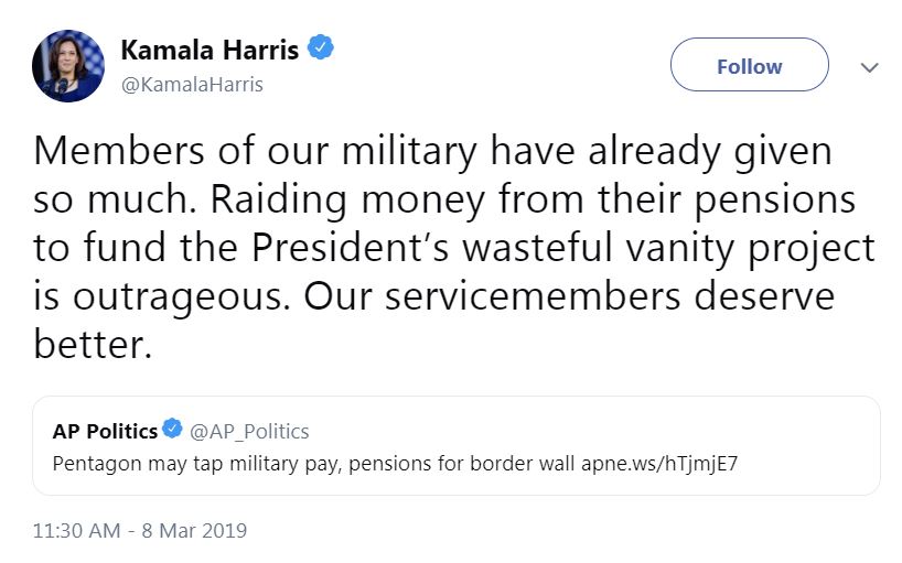 “Members of our military have already given so much. Raiding money from their pensions to fund the President’s wasteful vanity project is outrageous. Our servicemembers deserve better,” Harris said on March 8 on Twitter and Facebook.