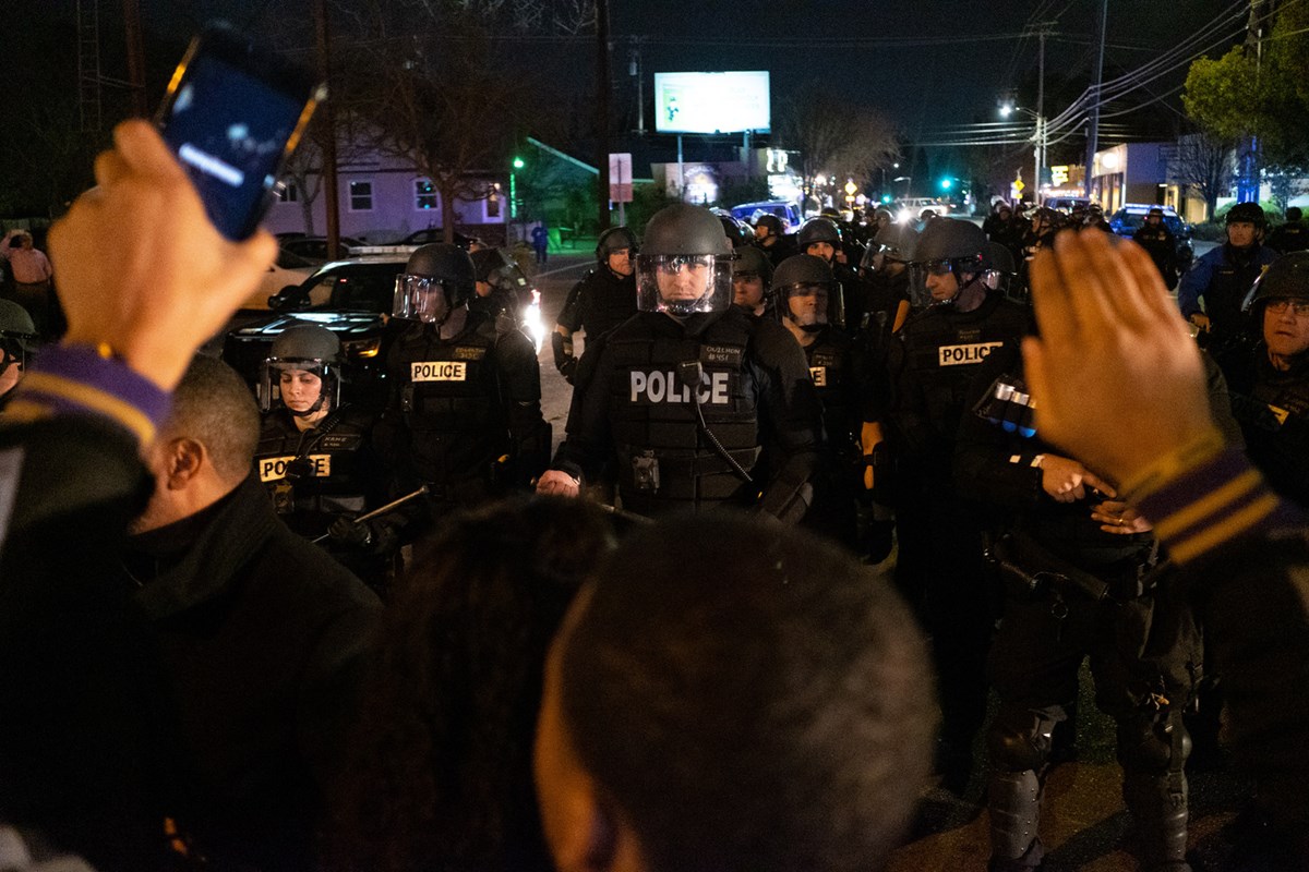 Police in Sacramento in March 2019 block protesters following a demonstration over the decision not to charge the officers who shot Stephon Clark. Andrew Nixon / Capital Public Radio