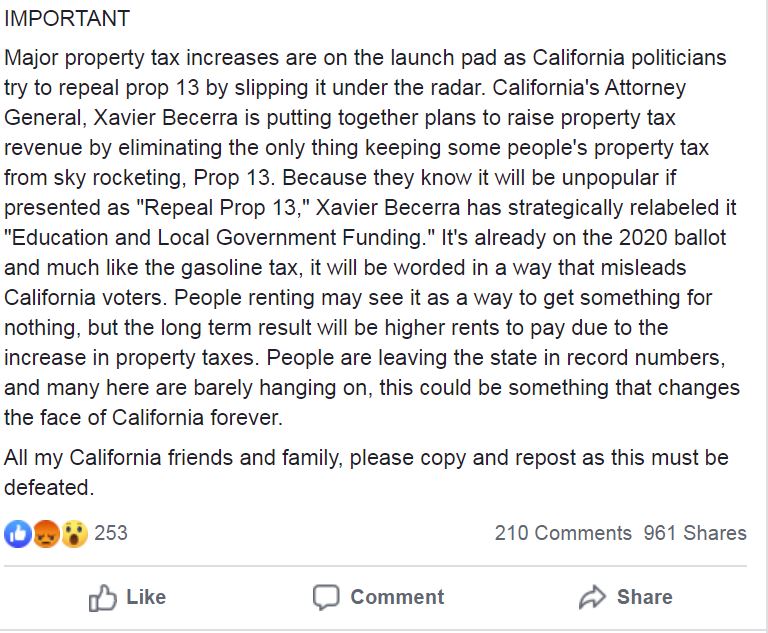 Yet many claims on social media suggest the initiative would repeal all parts of Prop. 13, stoking concerns that residential property taxes could spike.